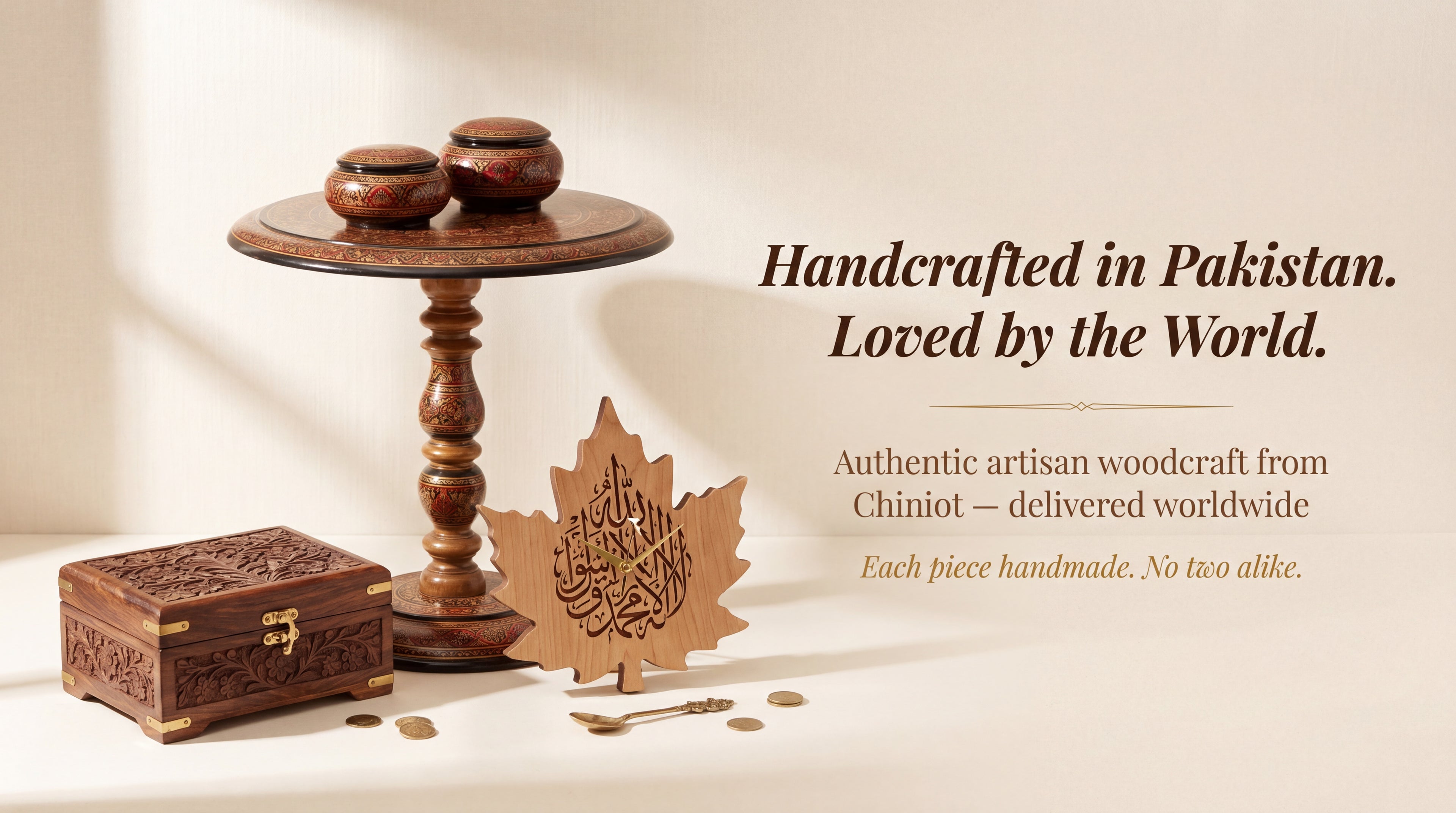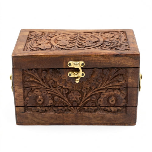 Hand-Carved Pakistani Wooden Jewellery Box with Red Velvet Interior